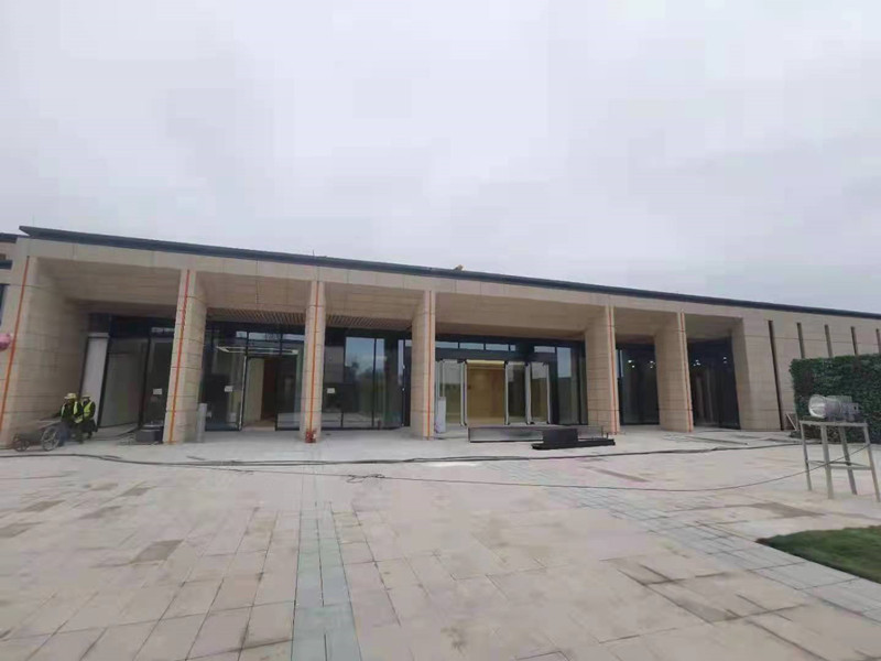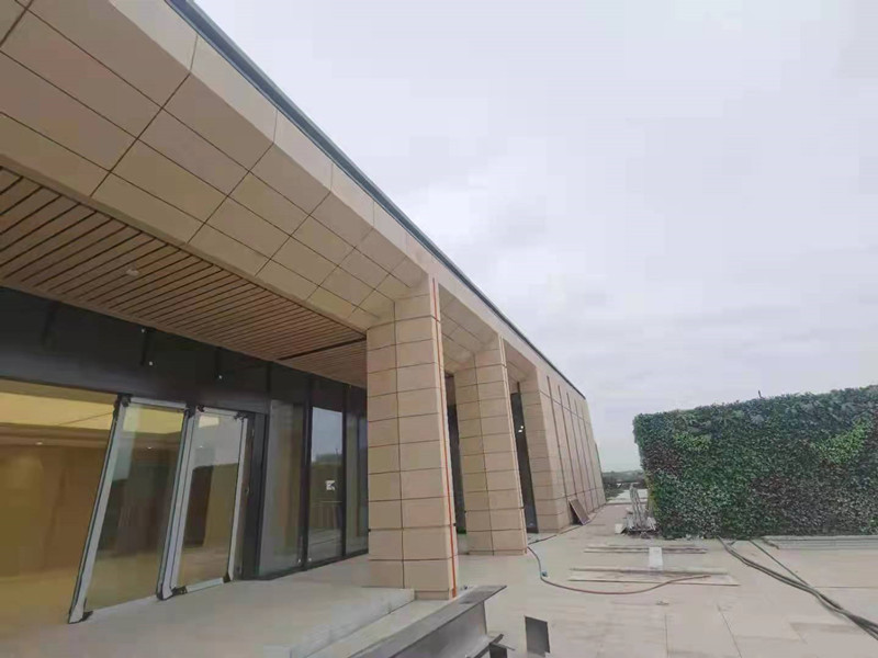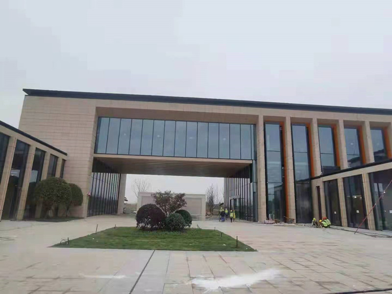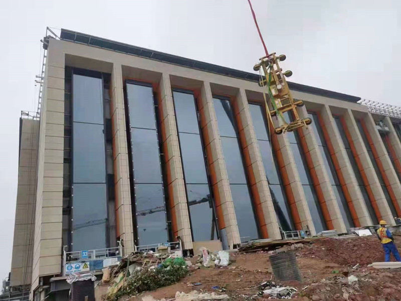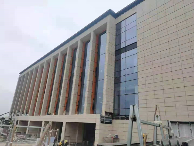 成都简阳东部新区市民中心办公楼采用22mm厚定制天府黄荔枝面轻质高强陶瓷板背栓式安装系统